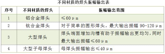 焊頭,都有額定的振幅輸出。針對(duì)不同材質(zhì)的焊頭,振幅輸出各不相同,在焊接生產(chǎn)的過(guò)程中,要保證在焊頭額定范圍內(nèi)輸出振幅,這樣才能在保證焊接效果的前提下,較小對(duì)焊頭的耗損,不使焊頭失效。不同材質(zhì)的焊頭振幅輸出如表所示: