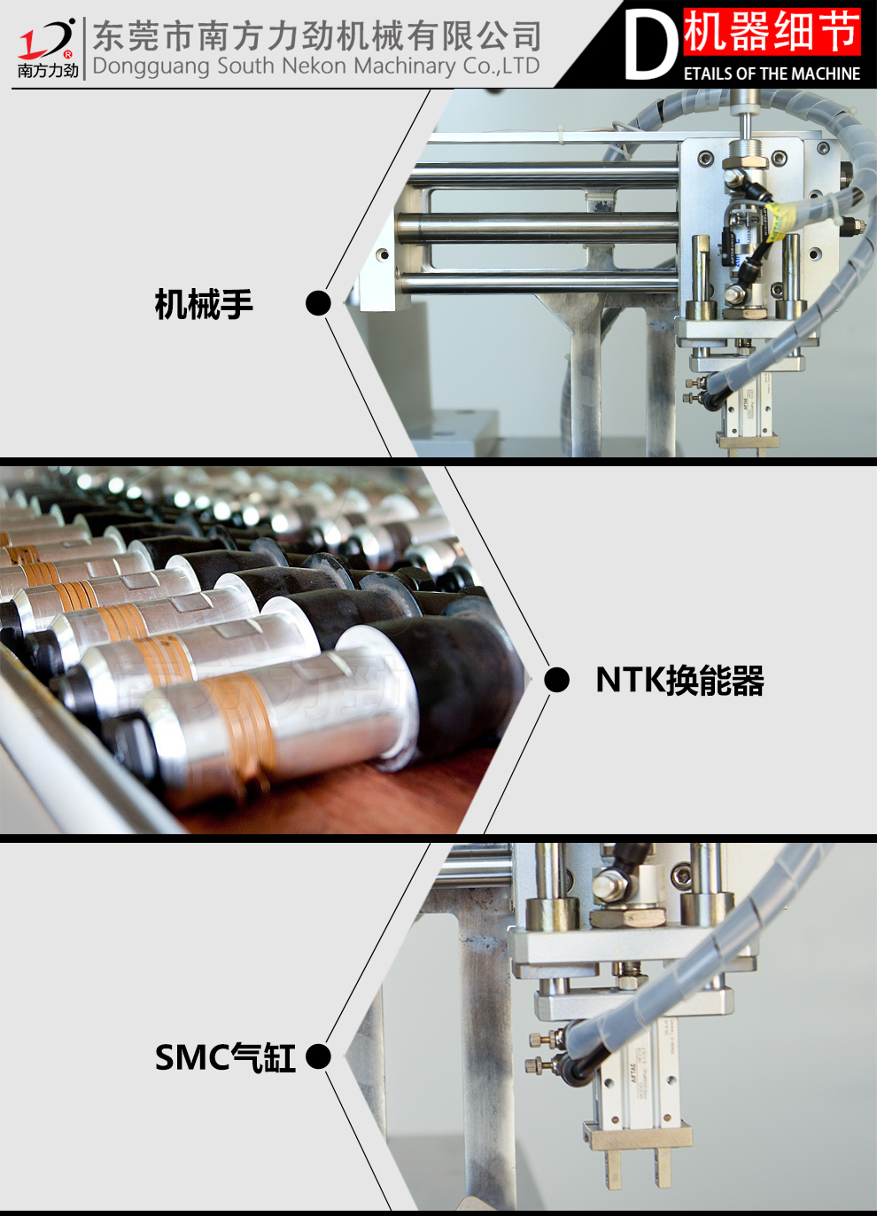 1.NTK換能器,SMC氣缸,功率強勁,穩定性好。