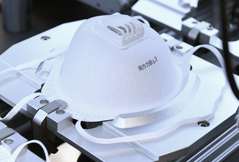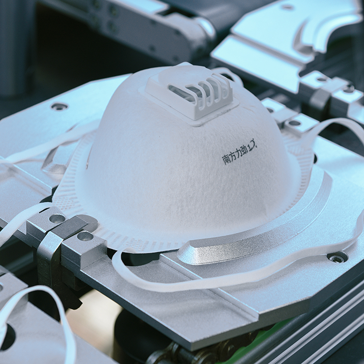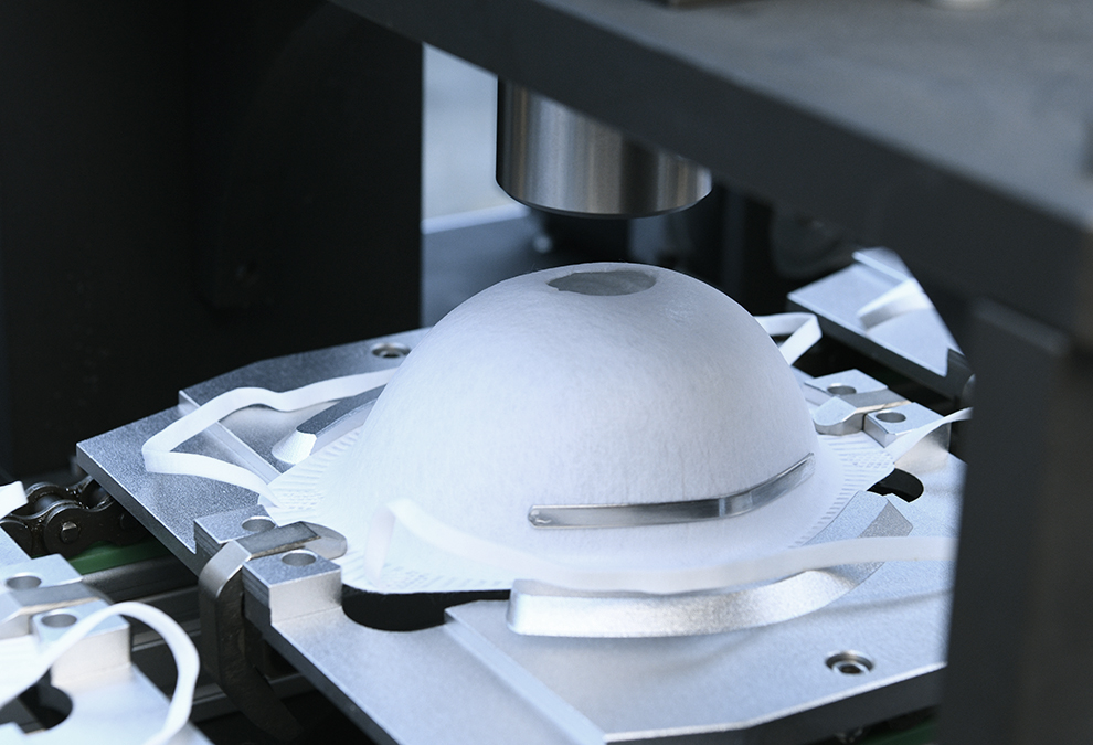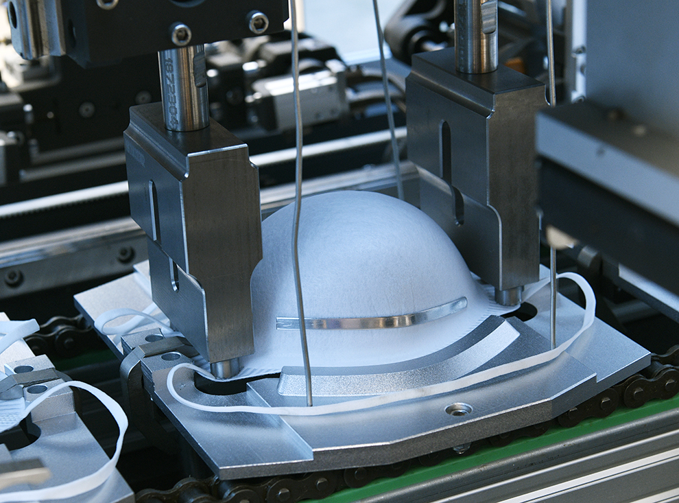 本機自動送料、熱貼鼻梁條、移印、焊耳帶、沖呼吸閥孔、自動上呼吸閥、自動焊接呼吸閥、自動出料堆疊等工序。